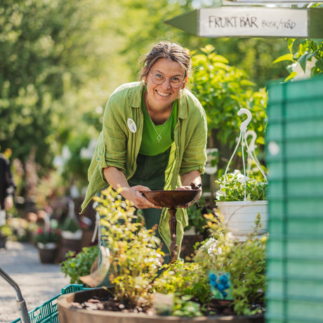 I trädgården hittar du säsongens blommor, olika kryddväxter, ett helt unikt brett sortiment av egenodlade tomat- och chiliplantor, grönsaksväxter, bärbuskar, fruktträd, perenner, rosor, klätterväxter, prydnadsbuskar och träd. Här finns också porlande fontäner, trädgårdstillbehör och trädgårdsdekorationer.