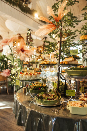 Frasiga fantasi-croissanter med räkor, parmesankräm och champagnekulor. HejconBacon med gurka, avokadokräm, bacon & sago-chips. Ljummen sallad. Blandat grönt med dipp. Julkorv. Grönskande smörgåstårta...mm